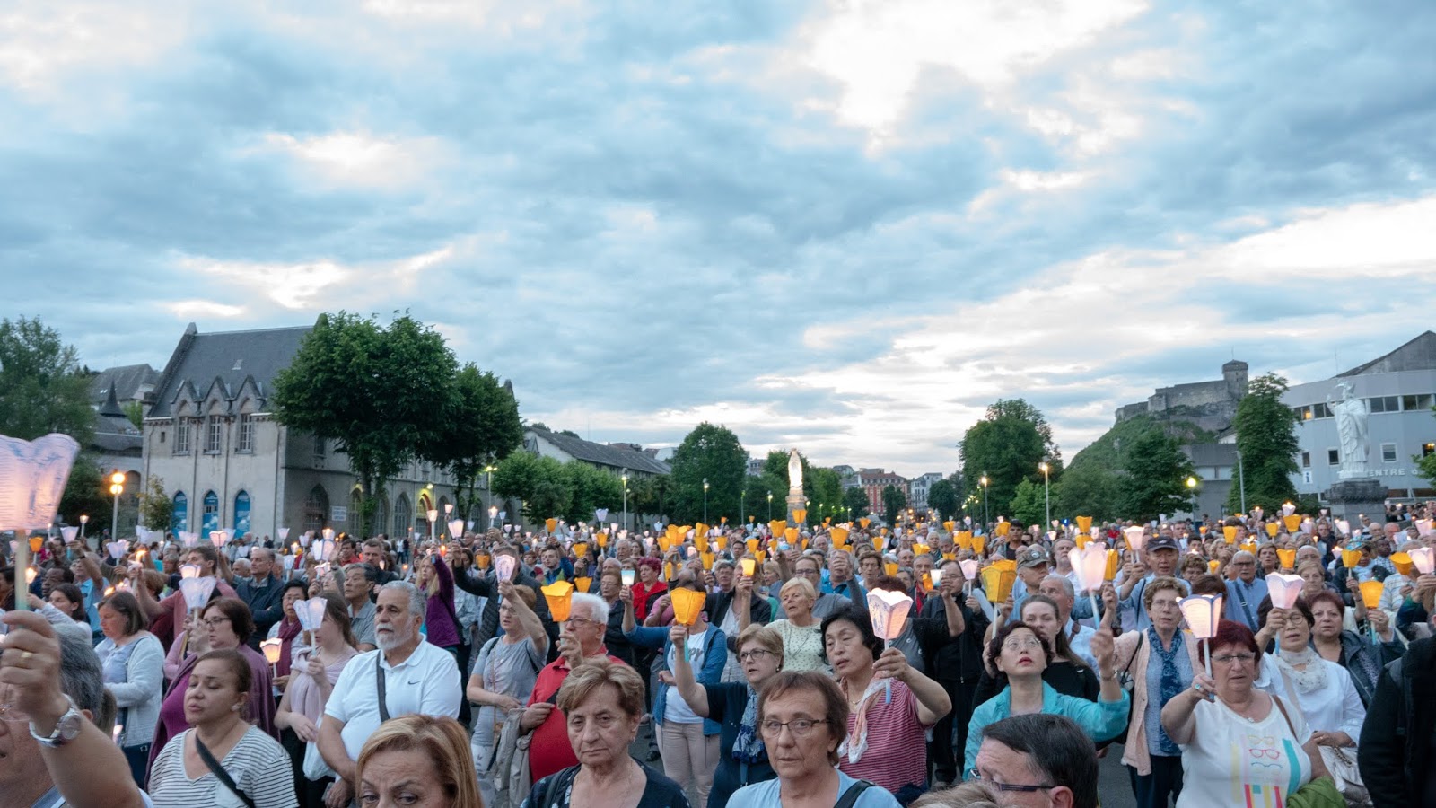 At the beginning of each decade, words in several languages give direction to the prayer and offer a point for meditation. In the calm of evening, each pilgrim carried their own personal intentions along with a candle. The procession ended in front of the church where the Ave Maria was sung for the final time. Afterwards, pilgrims dispersed and went back to their hotels for the night.
